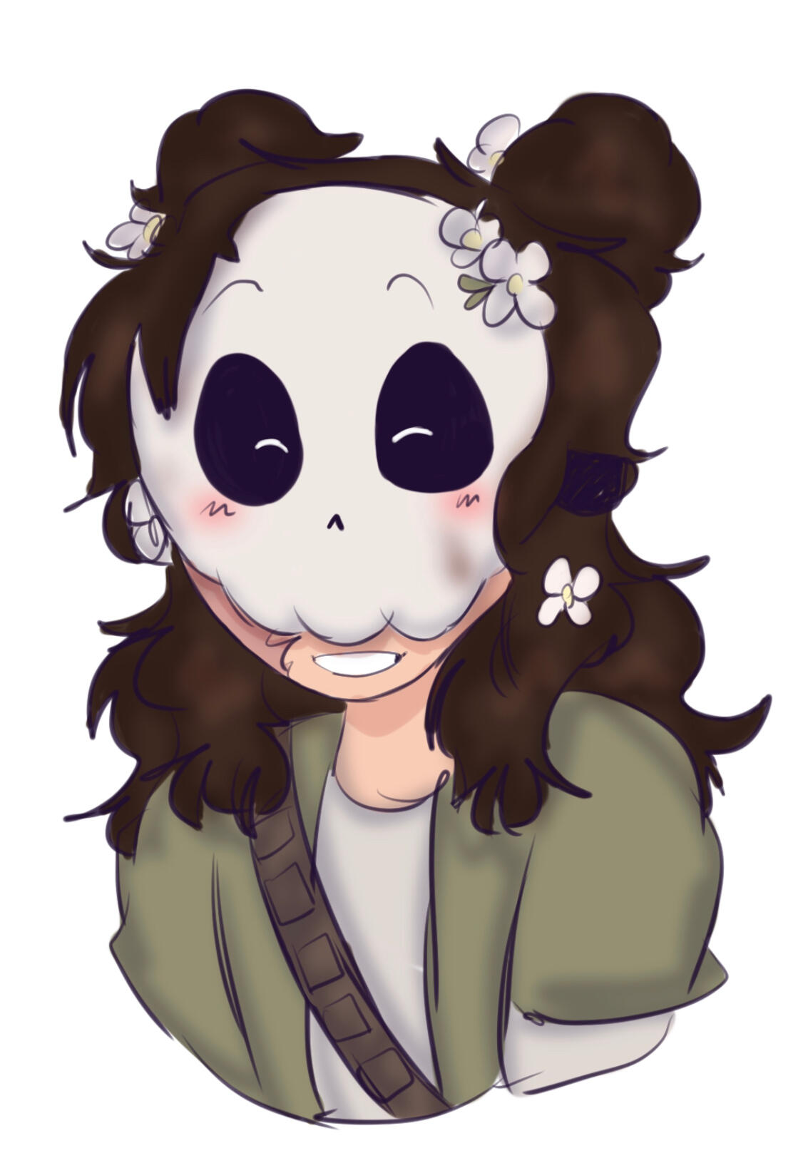01. The skull mask was a gift from her dad weeks before he died, she never takes it off.02. Shes taken Damien as her new dad /j